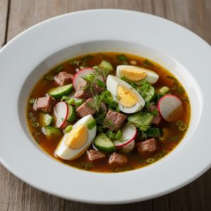 Квас, Яйцо куриное, Картофель, Сосиски, Огурцы свежие, Майонез Провансаль, Лук репчатый, Зелень Ассорти -
